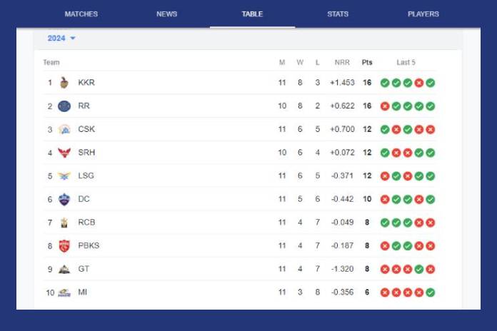 নাইটদের দখলে রয়েছে ১১ ম্যাচে আটটি জয় ও তিনটি হার। অন্যদিকে রাজস্থানের রয়েছে ১০ ম্যাচে আটটি জয় ও দু‘টি হার। চেন্নাই সুপার কিংসের রয়েছে ১১ ম্যাচে ১২ পয়েন্ট অন্যদিকে হায়দরাবাদের রয়েছে ১০ ম্যাচে ১২ পয়েন্ট। ১১ ম্যাচ খেলে ১২ পয়েন্ট নিয়েই পাঁচ নম্বরে রয়েছে। প্রথম পাঁচ দলের মধ্যে ১৬ ও ১২ পয়েন্টে রয়েছে দলগুলো। শুধু নেট রান রেটের বিচারে স্থান নির্ধারিত হয়েছে। সবার শেষে রয়েছে মুম্বই ইন্ডিয়ান্স। তাদের পয়েন্ট ছয়। তার আগের তিন দল বেঙ্গালুরু, পঞ্জাব ও গুজরাত রয়েছে আট পয়েন্টে। সকলেই খেলেছে ১১টি করে ম্যাচ। ১১ ম্যাচে ১০ পয়েন্ট নিয়ে ছয় নম্বরে রয়েছে দিল্লি ক্যাপিটালস।